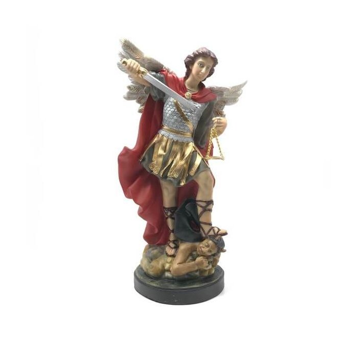 O manto vermelho representado na imagem de São Miguel é representa o amor de Deus, por estar sempre em sua presença, o Santo Arcanjo sempre trás consigo este amor que nos reconforta nos momentos de maior dificuldade.