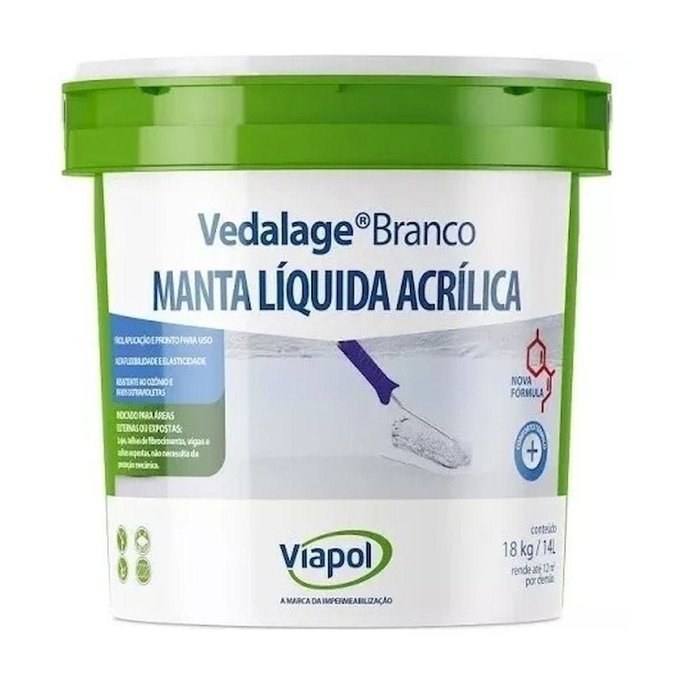 Vedalage® Branco é uma manta líquida pronta para uso à base de resina acrílica. Oferece alta elasticidade, flexibilidade e resistência às intempéries, além da propriedade de refletir os raios solares, proporcionado maior conforto térmico aos ambientes internos.