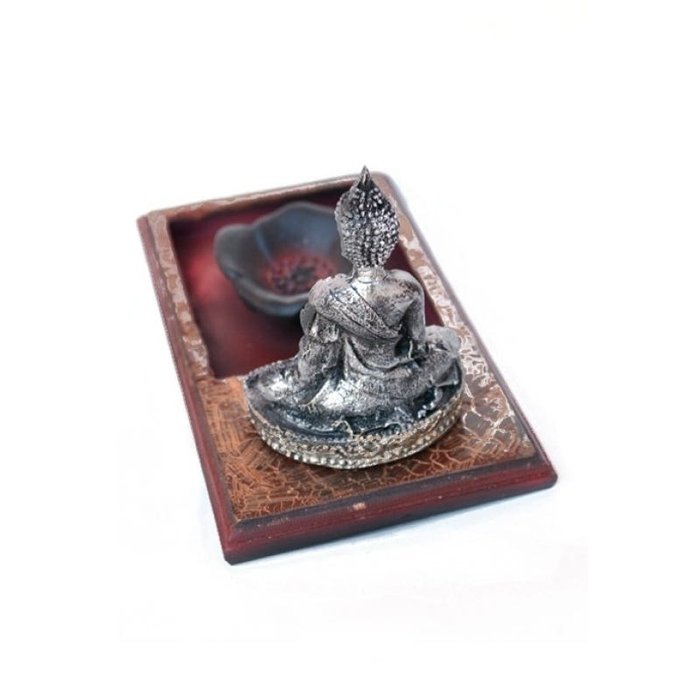 O incensário conta com a estatueta de um Buda em posição de meditação e espaço para a queima no centro.