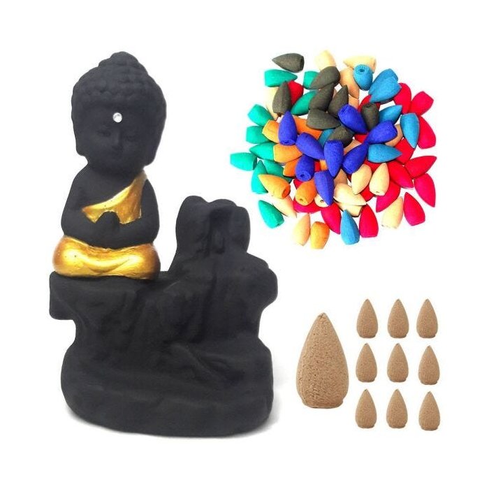 Incensário Cascata com Monge da Gratidão com 50 Incensos Cone - Azul Celeste