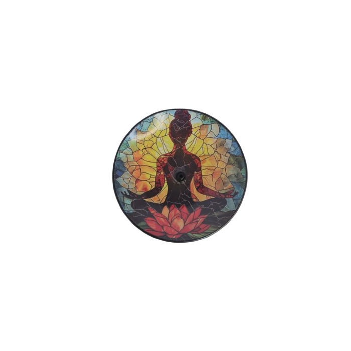 Incensário redondo de vidro com imagem de yogui me meditação, um lindo objeto para decorar seu espaço místico e ainda prático para o uso de incensos.