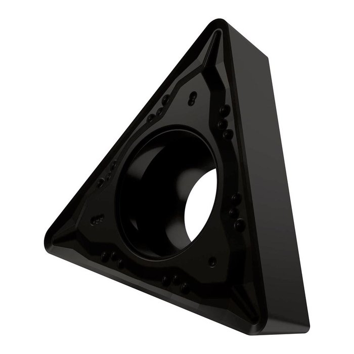 Inserto de torneamento face única positivo, triangular com 7° folga, diâmetro circunscrito de 9.525mm, 3.97mm espessurra, raio de ponta, 0.4mm precisão de indexação de acordo com a classe de tolerância ISO M, quebra-cavaco FM com arestas de corte redondas, na classe T9325, um revestimento MT-CVD metal duro WC-Co gradiente funcional dentro do parâmetro ISO P15-P35 e M10-M30, para fino para médio usinagem de aços e aços inoxidáveis