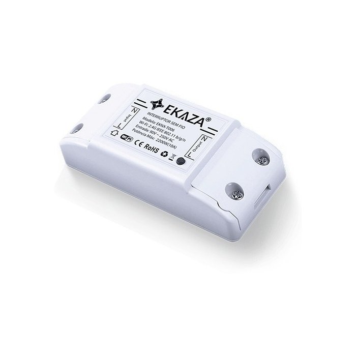 Especificação: Tensão: 100~240V AC, 50~60 Hz, Neutro/Fase // Corrente: 10A Máxima // Potência: 2200W@220V(Lâmpada Incandescente) // 600W@220V (Iluminação de LED) // Wi-Fi: 2,4Ghz IEEE 802.11 b/g/n // Distância: 30m(Roteador em visada direta) // ~ 5m (Com Parede) App: EKAZA / iOS 9.0 /Android 4.4 //