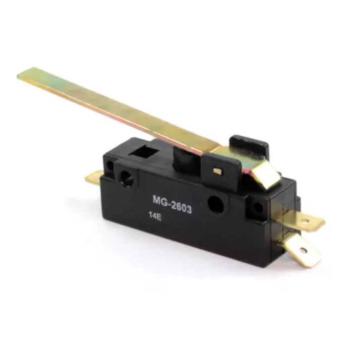 Micro interruptor de ação rápida MG-2603-- IR - Terminal Engate - com haste longa.Os micro interruptores de ação rápida da série MG-2600 MarGirius são utilizados em máquinas industriais, como movimentadores e outros equipamentos eletroeletrônicos. - Referência: MG-2603 IR/P1-CB- O interruptor MG-2603 pertence à série MG-2600, que possui modelos com as seguintes variações principais:-Funções: NA, NF ou reversível.-Atuadores: pino básico, pino com bucha, botão côncavo, botão convexo, haste rígida,- Haste rígida com rolete e haste flexível.- Características elétricas: 20A com carga resistiva em 120VCA ou 15A com carga resistiva em 250VCA.- Terminais: parafuso ou faston.