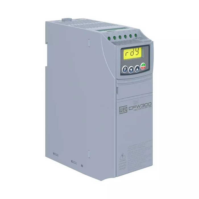 O inversor CFW300 possui tamanho compacto, instalação elétrica similar a contatores, controle vetorial WEG (VVW) ou escalar (V/F) selecionável, interfacede operação (IHM) incorporada, SoftPLC, software de programação WPS gratuito e acessórios tipo plug-in que podem ser incorporados, agregando mais funcionalidades, proporcionando uma solução flexível com excelente custo benefício. É destinado para o acionamento de motores trifásicos. Na faixa de potência de 0,25 a 10cv.