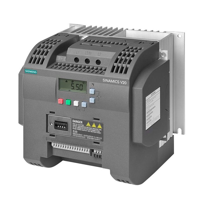 SINAMICS V20 380-480 V 3 CA -15/+10% 47-63 Hz potência nominal 5,5 kW com sobrecarga de 150% por 60 seg. E/S não filtrada: 4 DI, 2 DO, 2 AI, 1 AQ Fieldbus: USS/MODBUS RTU com proteção BOP integrada: IP20/UL tamanho aberto: C 184x182x169 (LxAxP)