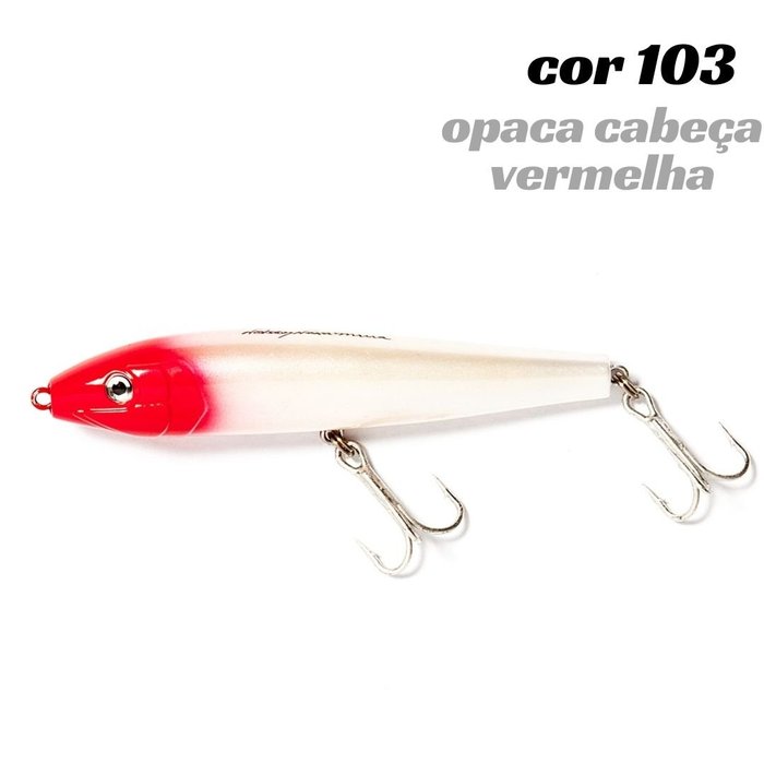 Isca artificial de superfície com chocalho forte (Ratlin) garatéia reforçada 4 vezes e com a flutuação rápida. Excelente para utilizar na técnica conhecida por Catimbinha que faz o predador atacar principalmente por irritabilidade.