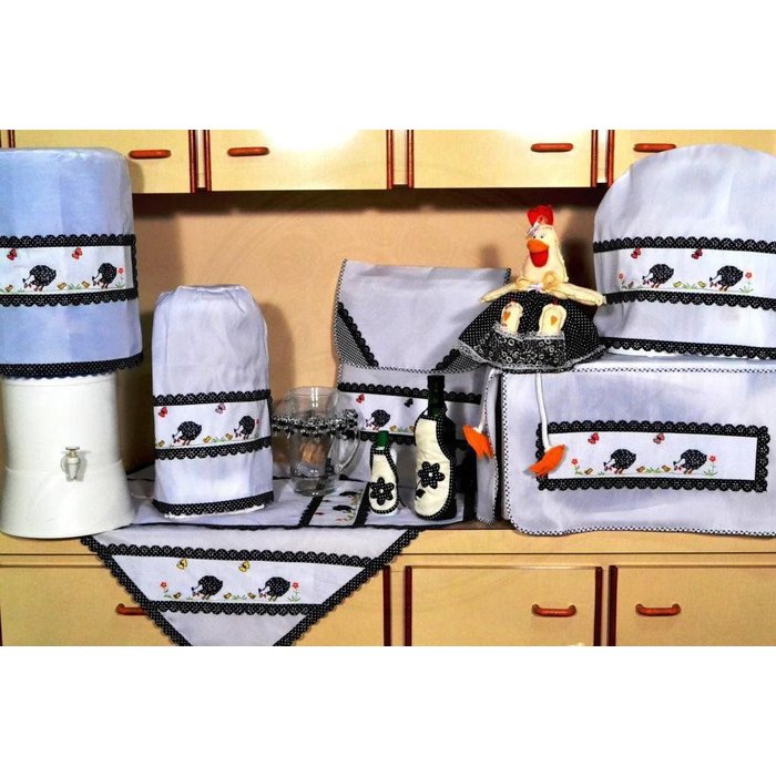 Itens para Cozinha em Bordado Ponto Cruz - Galinha D'Angola Dê um toque de beleza e arte em sua cozinha com este lindo jogo bordado em patchwork! Itens de cozinha fabricados com tecido tergal, com a cor de fundo branca, barrado bordado em ponto cruz e detalhe no meio com meigas galinhas D'Angola em preto e branco e acabamento em lesie preta com bolinhas brancas.A Arte & Tear vem com mais uma série de produtos lindos para a sua cozinha. Além da descontração e qualidade dessas peças, você ainda conta com produtos de fácil lavagem e secagem, alta durabilidade e muita beleza para alegrar a sua casa. Invista em peças que ajudem a proporcionar ainda mais bem estar para você e sua família! Peças vendidas separadamente: Formado por - 1 capa galão 20 litros- 1 capa galão 10 litros - 1 capa de liquidificador- 1 puxa saco - 1 capa de batedeira - 1 capa de microondas - 1 toalha centro 0,75 x 0,75m - 1 caminho 1,20 x 0,40m - 1 capa assadeira - 1 galinha decorativa com pintinhos- Kit mesa com 3 peças bordado - 1 avental de adoçante - 1 avental de garrafa ou azeite - 1 cobre jarra pedraria Composição:- 67% poliéster- 33% algodão- 100% algodão (faixa)