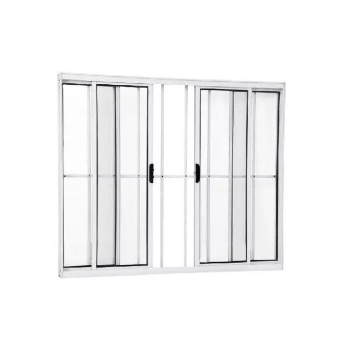 Janela de Correr COM GRADE com 4 Folhas de Vidro 4mm. Vidro Liso e Incolor. Com 2 Folha de Vidro Fixas e 2 Folhas de Vidro Móveis (de correr). Fecho Central e vidro já incluso, pronta para instalar.