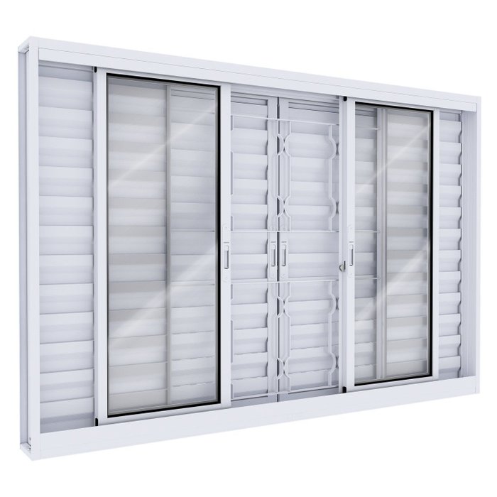 Com 6 folhas (2 fixas e 4 móveis), Seus vidros lisos são fixados com borracha EPDM, facilitando a troca em caso de necessidade. Conta ainda com pintura eletrostática em tinta poliéster a pó, sem parafusos aparentes e fechos de alumínio embutidos na cor do produto. São 6 anos de garantia para sua segurança. É um modelo ideal para quartos.