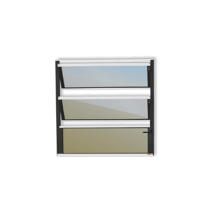 Janela Basculante de Alumínio Linha Plus Pintura Eletrostática Mix Preta 1 Folha Fixa e 2 Folhas Móveis Vidro Reflex Champanhe 3mm Altura 60 Cm Largura 80 Cm Requadro 2,5 Cm Garantia de 5 anos contra defeitos de fabricação.