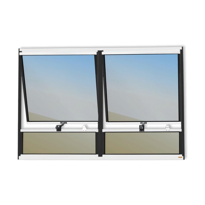 Janela Maxim -Ar 2 Seções C/ Bandeira de Alumínio Linha Plus Pintura Eletrostática Mix Preta Fecho tipo Braço articulado Escovas Vedadoras Hidrorrepelentes 2 Folhas Fixas e 2 Folhas Móveis Vidro Reflex Champanhe 3mm Altura 80 Cm Largura 120 Cm Requadro 3 Cm Garantia de 5 anos contra defeitos de fabricação