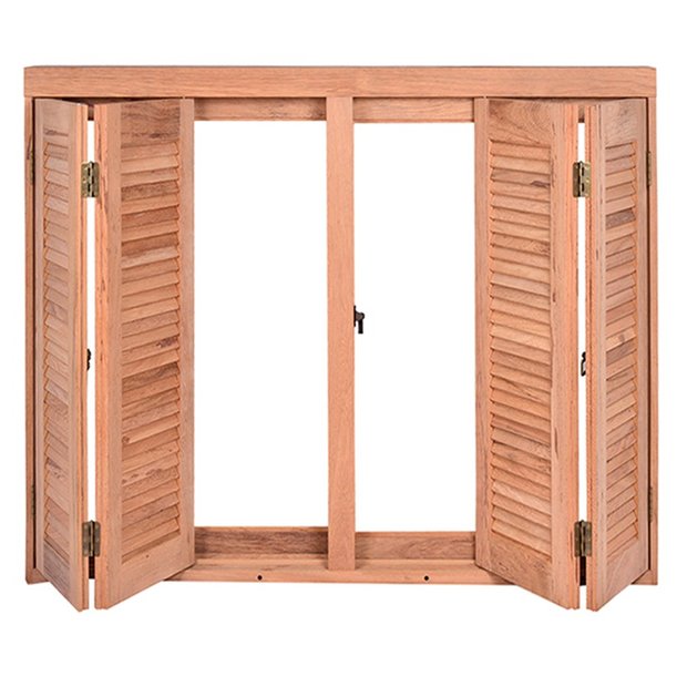 Este modelo acompanha cremonas e varetas embutidas, deixando o acabamento ainda mais sofisticado e moderno para o ambiente, também acompanha trilhos duplos facilitando a abertura das folhas, dobradiças, puxadores concha e trinco caracol, todas as ferragens já vão instaladas no produto. A janela é produzida em eucalipto maciço, seco e tratado.