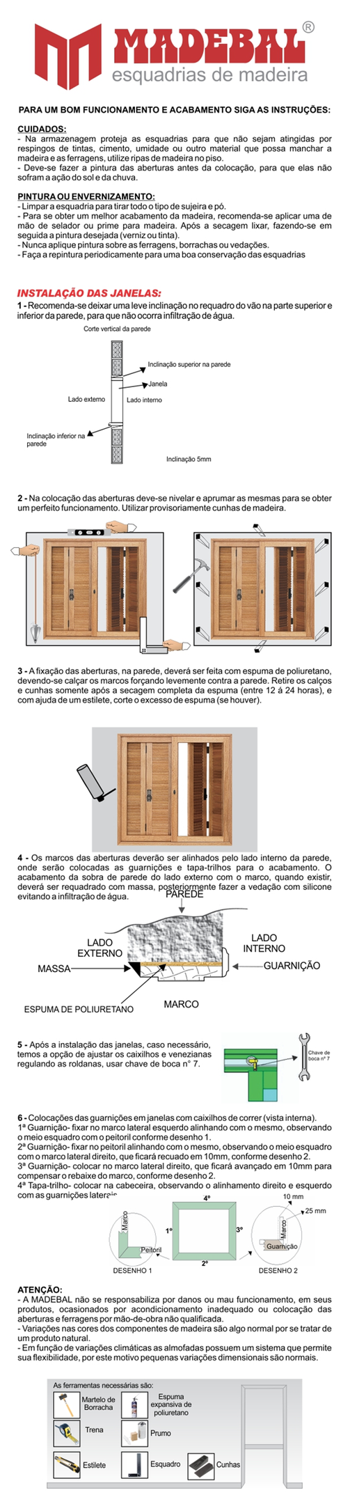 | Recomendações de Uso, Manutenção e Limpeza | Deve-se fazer a pintura das esquadrias antes da instalação, para que elas não sofram ação do sol e da chuva |