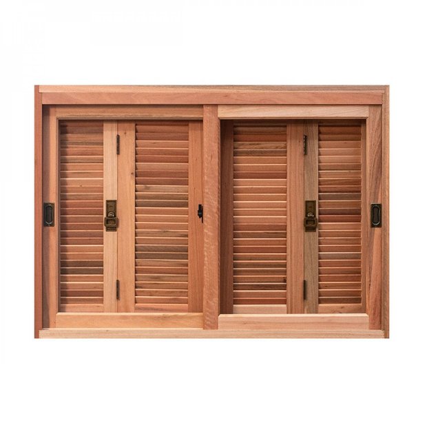 Janela de madeira maciça com 4 venezianas pantográficas (cotovelo), duas para cada lado e 2 caixilhos de correr, possui dobradiças com acabamento em ouro velho, 2 cremonas de embutir, trilho de alumínio e um fecho caracol. Acompanha guarnição (vistas) 6 cm PARA UM LADO. O tom da madeira pode variar, por se tratar de um produto natural. A matéria prima (madeira) passa por um processo de secagem de 18 meses, incluindo secagem em estufa, os produtos saem da fábrica com lixamento pronto para pintura ou aplicação de selador e verniz.