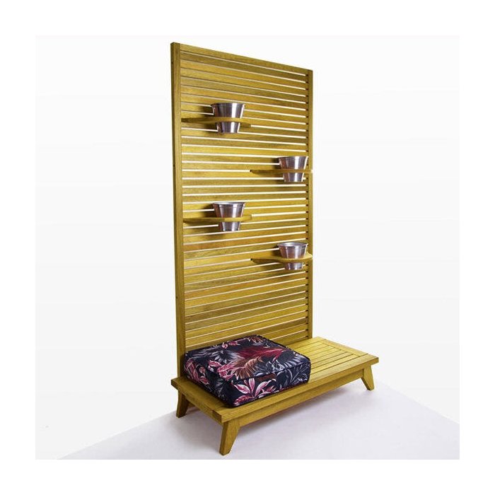 Jardineira estruturada em madeira de reflorestamento de eucalipto, material que segue uma nova e promissora tendência sustentável e ecologicamente correta. A peça conta com painel, assento, almofada e 4 prateleiras com encaixe para vasos. Com linhas sóbrias e design clean, o elemento se destaca pelo charme, sendo uma ótima opção para decorar ambientes externos. Ter flores e plantas em casa é uma ótima opção para aproximar-se da natureza, principalmente para quem vive em grandes cidades e estabelecer esse contato fica mais difícil. Com este item é possível inserir um pedacinho de verde à decoração, mesmo em ambientes com pouco espaço.