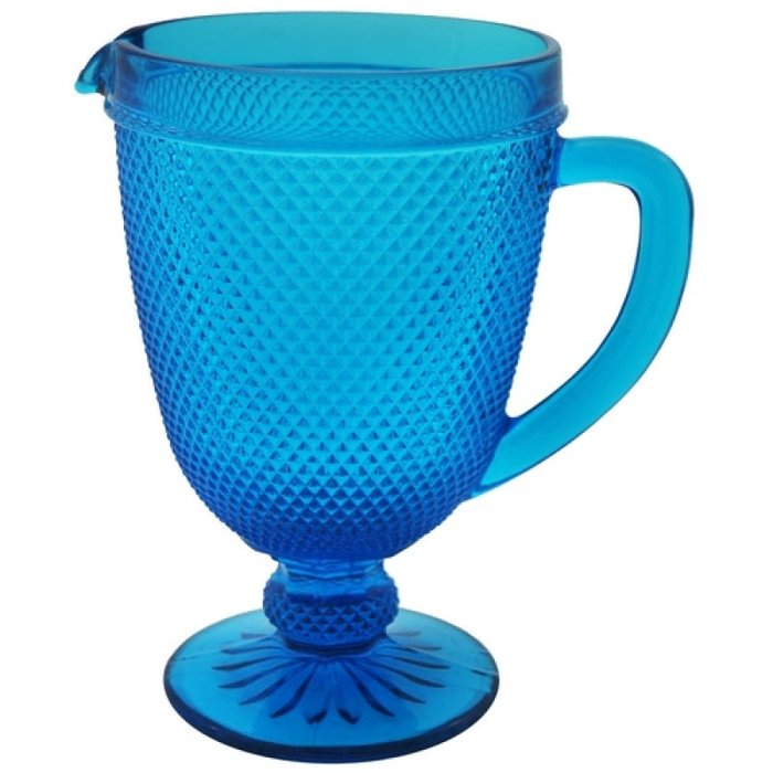 Jarra bico de jaca em vidro azul, assentada por base circular, com alça e detalhes decorativos em relevo.