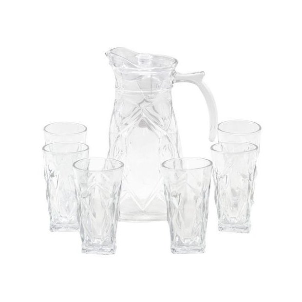 Jarra de Vidro com 6 Copos Tampa 1800ml Jarra produzida em vidro de qualidade com formas e linhas moderna. Peça ideal para acompanhar diversas ocasiões. Tampa (acrílico) que além de proteger, conserva a bebida. Produto importado, material resistente e com alta durabilidade.Ideal para servir seus convidados com água, sucos, refrescos e refrigerantes.Acompanha um lindo jogo de 6 coposDimensões Jarra:Altura: 26 cm Largura: 18 cmCapacidade: 1.800ml CoposCapacidade: 300mlREF: VS68-