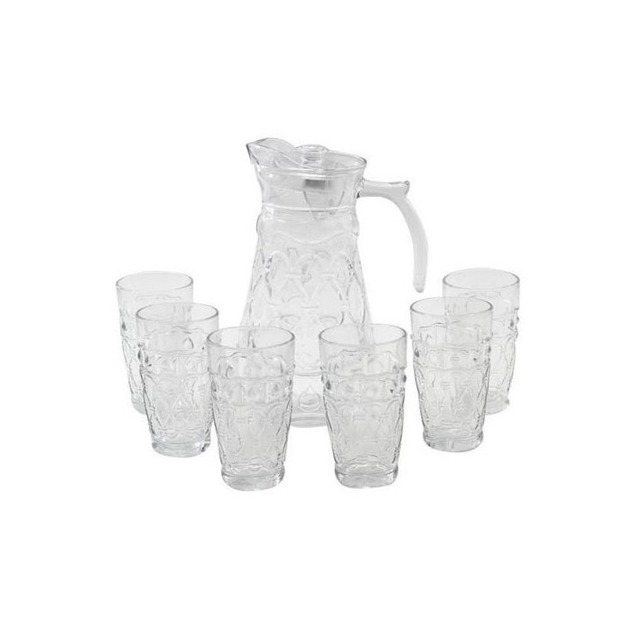 Jarra de Vidro com 6 Copos Tampa 1800ml Jarra produzida em vidro de qualidade com formas e linhas moderna. Peça ideal para acompanhar diversas ocasiões. Tampa (acrílico) que além de proteger, conserva a bebida. Produto importado, material resistente e com alta durabilidade.Ideal para servir seus convidados com água, sucos, refrescos e refrigerantes.Acompanha um lindo jogo de 6 coposDimensões Jarra:Altura: 26 cm Largura: 18,5 cmCapacidade: 1.800ml CoposCapacidade: 300mlREF: VS61-
