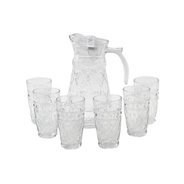 Jarra de Vidro com 6 Copos Tampa 1800ml Jarra produzida em vidro de qualidade com formas e linhas moderna. Peça ideal para acompanhar diversas ocasiões. Tampa (acrílico) que além de proteger, conserva a bebida. Produto importado, material resistente e com alta durabilidade.Ideal para servir seus convidados com água, sucos, refrescos e refrigerantes.Acompanha um lindo jogo de 6 coposDimensões Jarra:Altura: 26 cm Largura: 18,5 cmCapacidade: 1.800ml CoposCapacidade: 300mlREF: VS61-