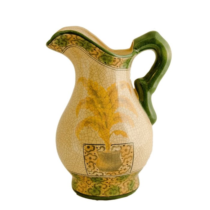 Jarro Bojudo Em Cerâmica Brilhante Com Acabamento Em Craquelê (22x17x31,5cm) fundo fendi com pintura de palmeira amarela, contornos verdes e desenhos de flores.