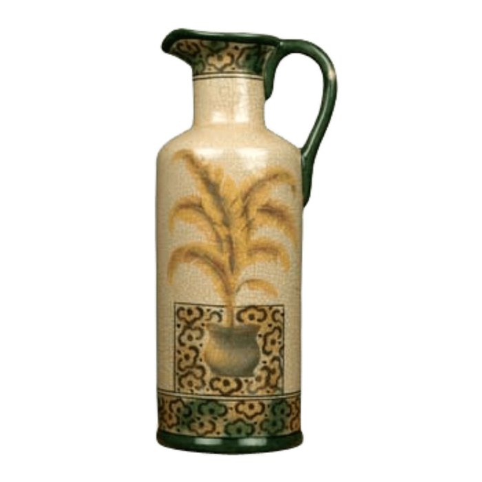 Jarro (vaso) De Cerâmica Brilhante Com Acabamento Craquelê (14,5x12,5x34cm) Fundo na cor Fendi e pintura de uma palmeira amarela, contorno verde e desenho de flores