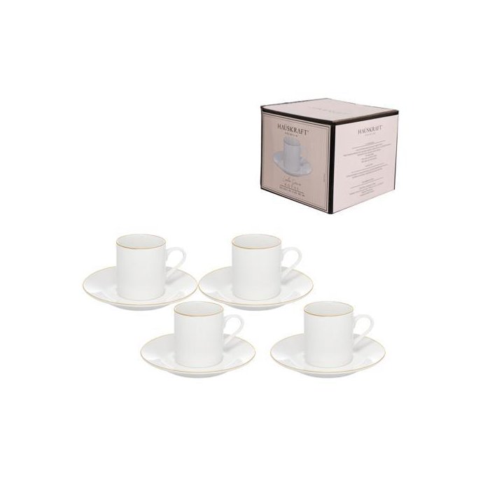 Jogo de Xícaras para Café com Pires – Linha Royal (4 Peças) – Haüskraft Descrição Comercial Detalhada: Para que cada instante à mesa seja sublime, os mínimos detalhes fazem toda a diferença. A linha Royal da Haüskraft® traz sofisticação e elegância com este Jogo de Xícaras para Café com Pires em cerâmica branca com um delicado filete dourado na borda. O design clean, singelo e minimalista valoriza a beleza genuína da mesa posta, tornando cada café um momento especial e requintado. Com capacidade de 90 ml, estas xícaras são ideais para servir café espresso em reuniões formais, cafés da manhã ou ocasiões especiais. A combinação clássica de branco e dourado agrega um toque de luxo e requinte à sua composição de mesa, impressionando seus convidados com elegância discreta e atemporal. Ficha Técnica: Produto: Jogo de Xícaras para Café com Pires Linha: Royal Marca: Haüskraft Material: Cerâmica Cor: Branco com filete dourado Origem: Índia Tipo de Embalagem: Caixa Litografada Dimensões das Peças: Xícaras (4 unidades): 8 cm (Comprimento) x 5,5 cm (Largura) x 6 cm (Altura) / Capacidade: 90 ml Pires (4 unidades): 13 cm (Diâmetro) x 1 cm (Altura) Dimensões da Embalagem: Caixa Litografada: 13 cm (Comprimento) x 13 cm (Largura) x 11 cm (Altura) Dimensões Master: Quantidade Master: 8 peças Dimensões Master: 31 cm x 22 cm x 21 cm Características do Produto: Design Elegante: