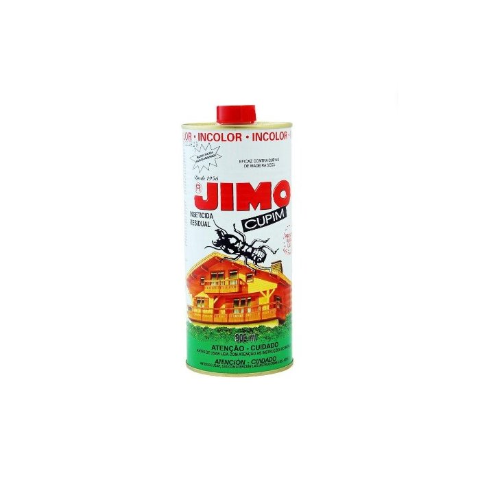Descrição do Produto: JIMO Cupim é um inseticida pronto para uso eficaz contra cupins e brocas. É recomendado para vários tipos de madeira, podendo ser aplicado em assoalhos, forros, portas, janelas, móveis e madeiramentos de telhados. COMO USAR 1. Produto pronto para uso. Não diluir com solventes ou outros produtos. 2. Para que o produto penetre profundamente em seus veios, a madeira deve estar seca e sem acabamento. Caso já apresente algum tipo de acabamento, recomenda-se então a sua remoção com lixa ou removedor. Não sendo possível tal remoção, recomenda-se a aplicação pontual de JIMO Cupim Aerossol nos orifícios ou pontos de madeira oca que indicam a presença de insetos. 3. A aplicação pode ser feita com pincel, pulverizador ou por imersão. 3.1. Pincelamento: Deve ser aplicada 1 demão farta em todas as faces da madeira. 3.2. Imersão: Em geral, 30 segundos de imersão é suficiente. É necessário um tanque dimensionado de acordo com o material a ser tratado e, para evitar perdas do imunizante, é indicada a instalação de uma calha de drenagem, a fim de recolher o excesso de produto que escorrer da madeira para reutilização posterior. MAIS INFORMAÇÕES RENDIMENTO: O rendimento médio por pincelamento varia de 3 a 10 m² por litro, dependendo da densidade da madeira, técnica de aplicação e da preparação da superfície. SECAGEM: De 48 a 72 horas, variável de acordo com as condições climáticas do local.