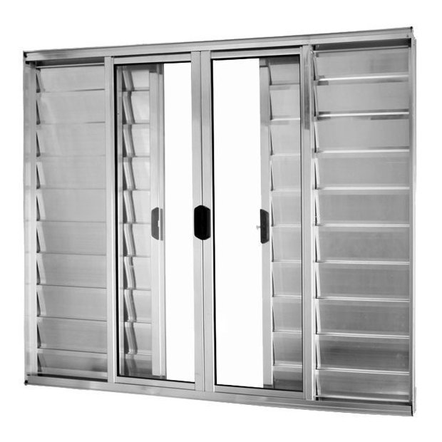 - Duas folhas fixas com palhetas cegas, duas folhas móveis com palhetas ventiladas (acompanham trinco para fechar) e duas folhas móveis com vidro incolor de 3mm (acompanham trinco para fechar).