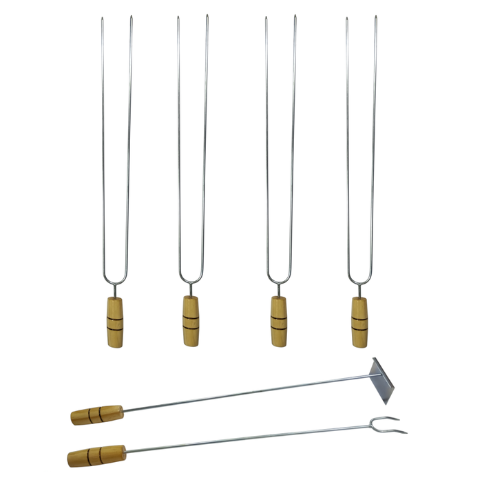 Jogo de espetos para Churrasco com 4 espetos duplos, garfo para churrasco, rastelo espalhador de brasa 60 cm.