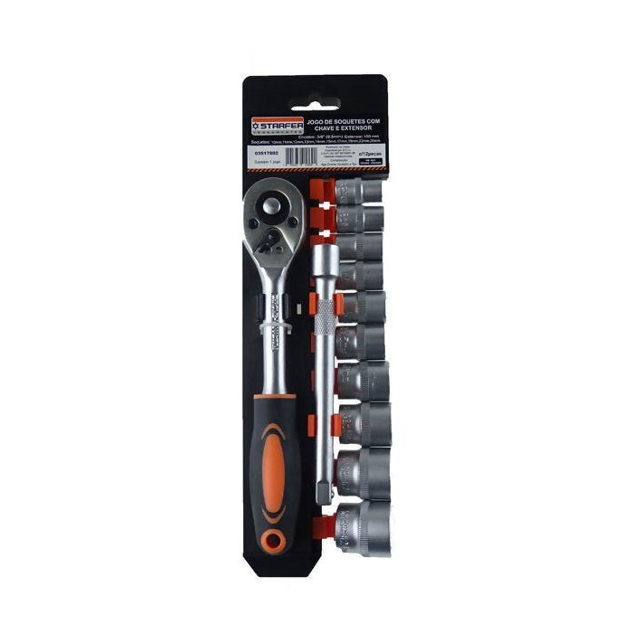 - Jogo 10 Peças Soquete com encaixes de: 10mm, 11mm, 12mm, 13mm, 14mm, 15mm, 17mm, 19mm, 22mm e 24mm.