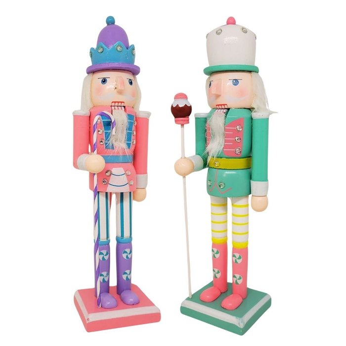 Jogo 2 Bonecos Quebra Nozes Decorado Madeira Candy Verde e Rosa Color 30cm Boca Articulada - Master