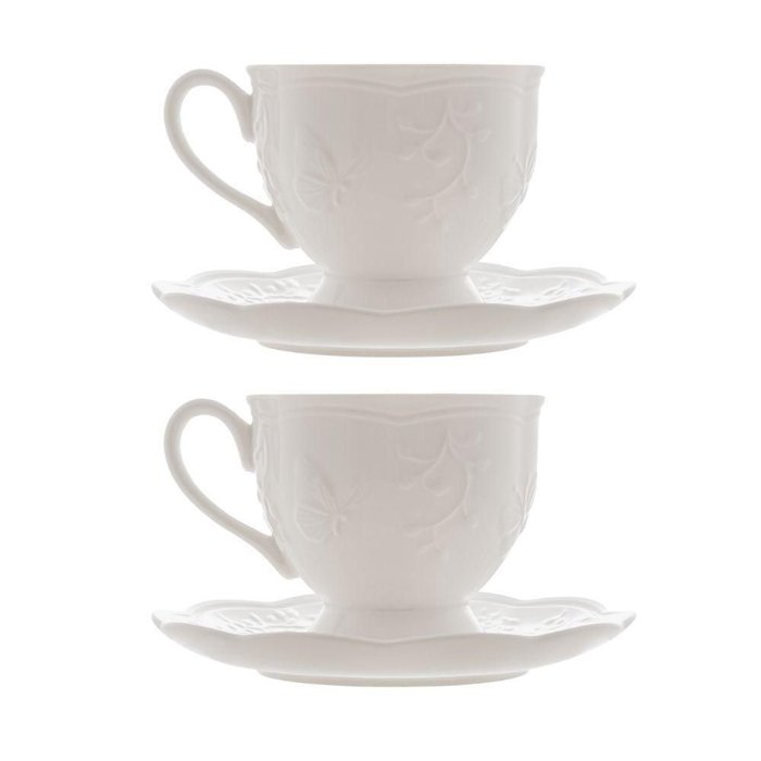 Jogo 2 Xícarasde Café com Pires em Porcelana New Bone Butterfly Borboleta e Flores 100ml Lyor Branco