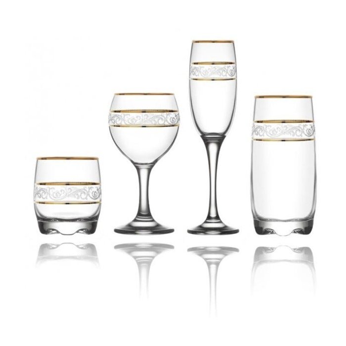Jogo Exclusivo da linha Misket e Adora Sultan com 24pç Completo (6 unidades de cada copo/taça) - Vitrizi Conteúdo: -06 Copos Whisky Adora Sultan 290ml - Vitrizi -06 Copos Long Drink Adora Sultan 390ml - Vitrizi -06 Taças água/vinho tintio Adora Sultan 260ml - Vitrizi -06 Taças Champagne Adora Sultan 190ml A nível de estilo e elegância, a linha Adora Sultan da Vitrizi é admirável Possui design em modelagens arcaico dourado, que nos faz referir a épocas clássicas Seja criativo e enriqueça a sua elegância na hora de servir seus long drinks e cockteis Modelo: Transparente com friso dourado e desenho jateado Instruções de uso: -Lavar com esponja macia antes de usar. -Não ir ao lava louças -Não utilizar com líquidos acima de 70 graus Composição: 100% vidro Marca: Vitrizi
