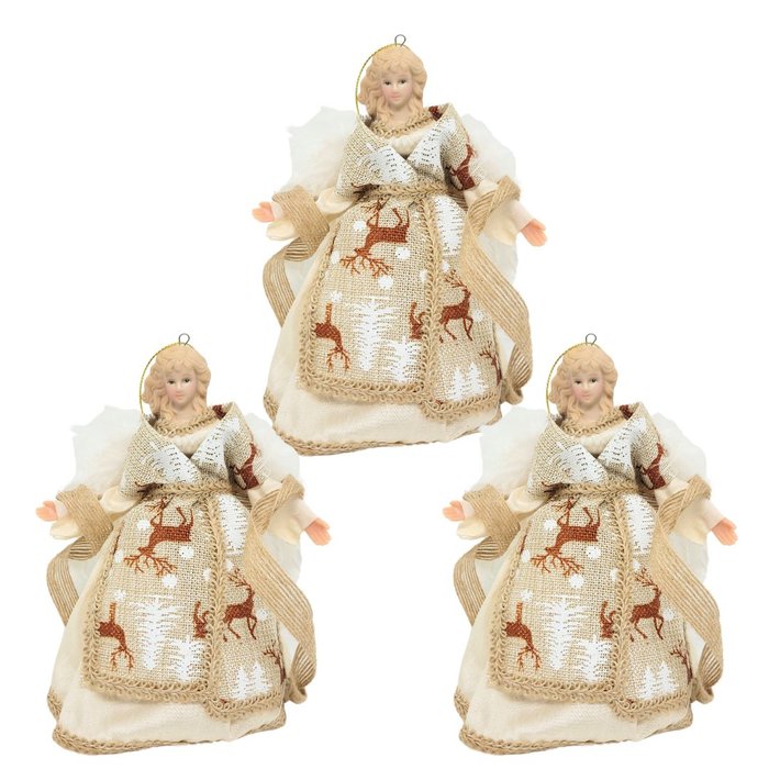 Jogo 3 Anjos Natal Pendente Rústico Bege Estampado Rena 17cm