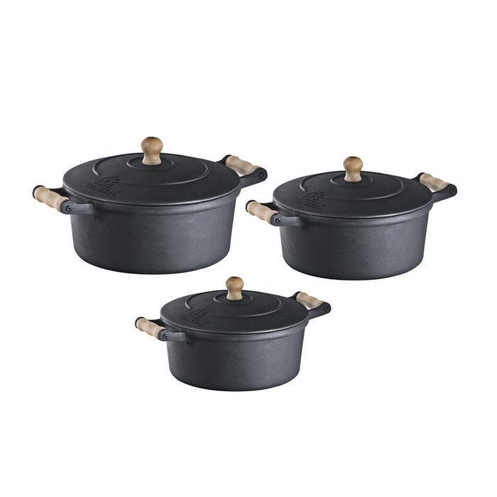 Jogo 3 Und Caçarolas Ferro E Alça Madeira 5,9, 7,6 E 9,8 L