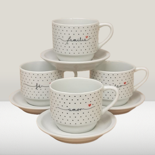 Jogo 4 xícaras Café Chá c/ pires Frases Motivacionais - 200 ml Empilháveis - Poá Preto