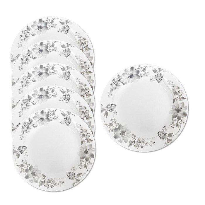 Jogo 6 Prato Raso de Vidro Branco Flores Cinza Flowers Grey 26cm em Casa Tem