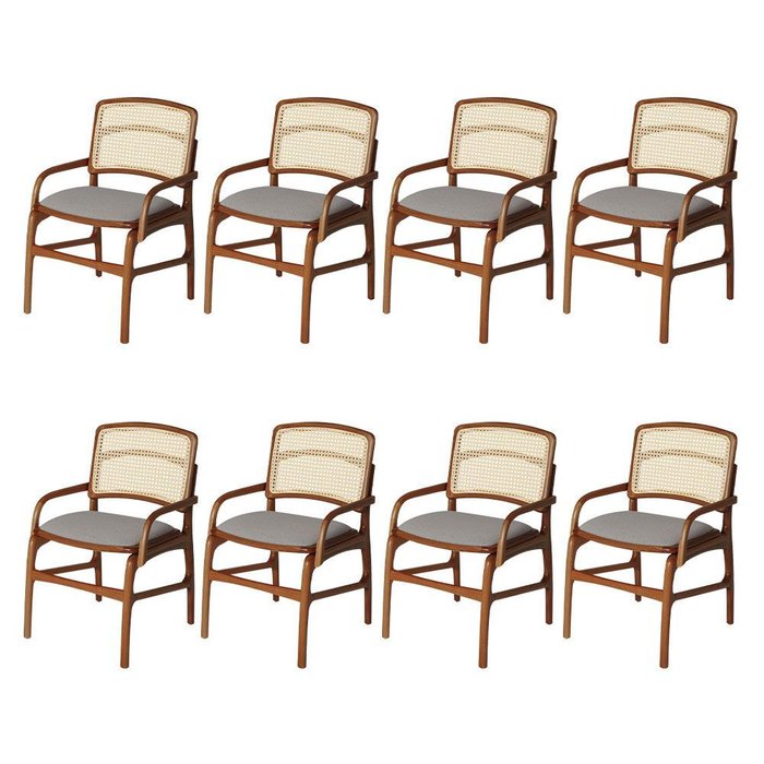 Jogo 8 Cadeiras para Jantar Florença em Madeira Jequitibá Terra Braço Encosto Palha Linho Cinza