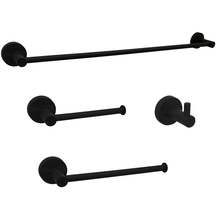O Kit de Acessórios para banheiro black Dona D.cor conta com produtos robustos e de qualidade, fabricados em Aço Inox 304, com 4 suportes: cabide/gancho, papeleira (porta papel higiênico), porta toalha de rosto e porta toalha de banho. Todas as peças na cor preta com acabamento fosco, podendo ser utilizado tanto em banheiro e suítes, quanto em lavabos. Instalados com fixação dupla para melhor estabilidade e durabilidade, ajudam a deixar seu banheiro organizado, moderno e sofisticado. Super resistentes. Qualidade Premium.