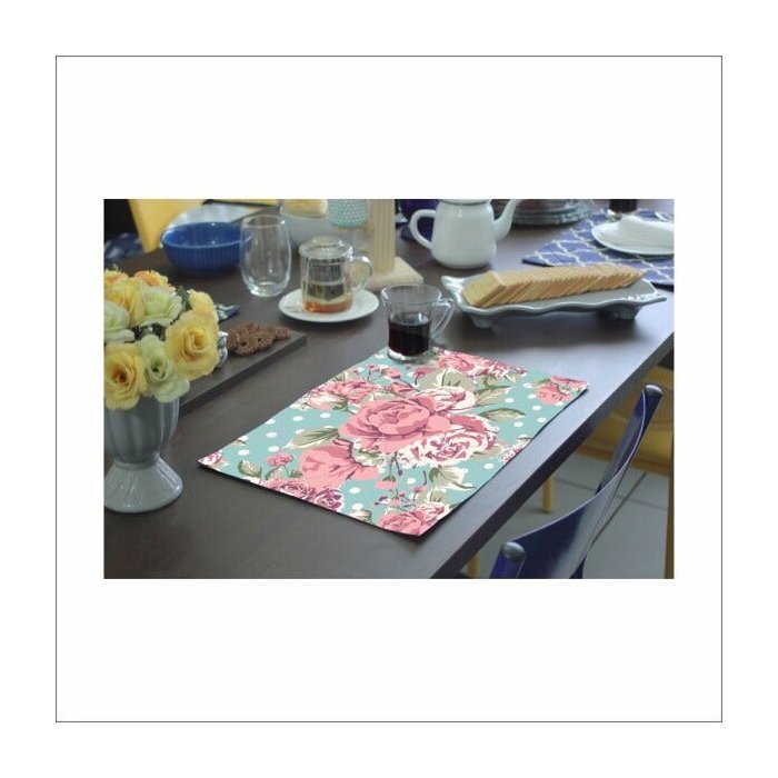 Jogo Americano De Tecido Matelasse Dupla Face Flores Rosa Fundo Poa- 4 Peças Colorido