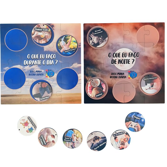 Como Jogar? O jogo é composto por dois quebra-cabeças , que, ao serem montados, mostram a placa da rotina diária de uma pessoa — de manhã e à noite. Além disso, há diversas pecinhas com ilustrações de atividades que você deve associar corretamente às placas, decidindo se aquela ação ocorre de dia ou de noite.