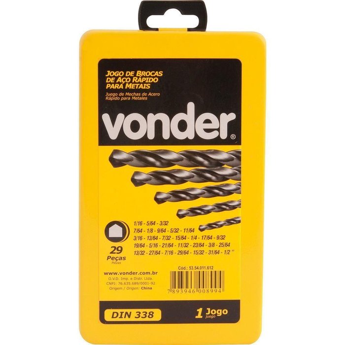 1 Jogo de brocas de aço rápido DIN 338, com 29 peças, sendo: 1/16? ? 5/64?? 3/32?? 7/64?? 1/8?? 9/6??? 5/32?? 11/64?? 3/16?? 13/64?? 7/32?? 15/64? ? 1/4??? 17/64"? 9/32"? 19/64"? 5/16"? 21/64"? 11/32"? 23/64"? 3/8"? 25/64"? 13/32"? 27/64"? 7/16"? 29/64"? 15/32"? 31/64"? 1/2"
