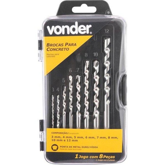 1 Jogo de brocas para concreto com 8 peças, sendo: 3 mm, 4 mm, 5 mm, 6 mm, 7 mm, 8 mm, 10 mm e 12 mm
