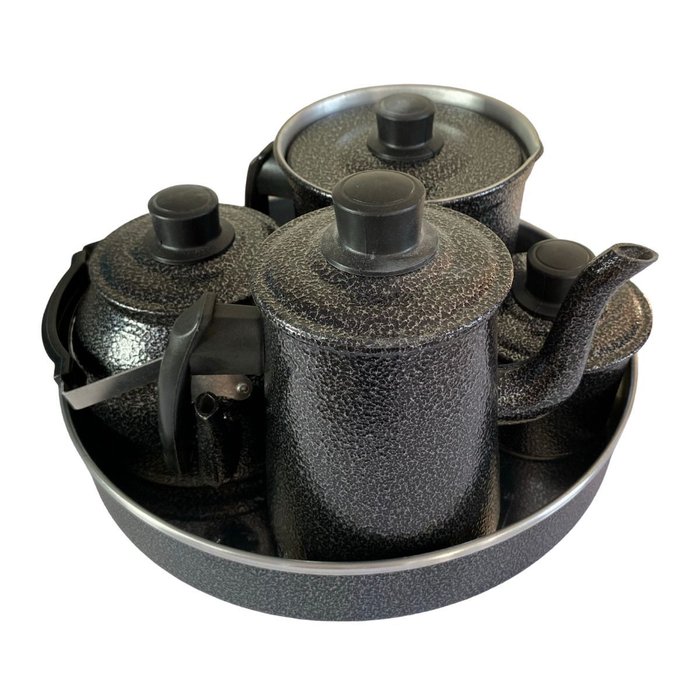 Transforme sua cozinha em um verdadeiro refúgio de aconchego com o Kit Colonial Preto Craqueado, composto por forma para bolo, chaleira, leiteira, bule e açucareiro.