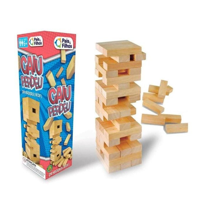 O jogo caiu perdeu é fabricado em madeira mdf de alta qualidade para garantir durabilidade e resistência durante seu uso. Para dar início ao jogo, uma torre com os blocos deverá ser montada, cada jogador retira um bloco de qualquer andar, vão empilhando por cima da torre de forma que ela crie novos andares e não perca o equilíbrio. Quanto mais a torre aumenta, mais divertida a brincadeira fica, perde o jogo quem deixar a torre cair primeiro. Esse jogo desenvolve a estratégia e a coordenação motora.