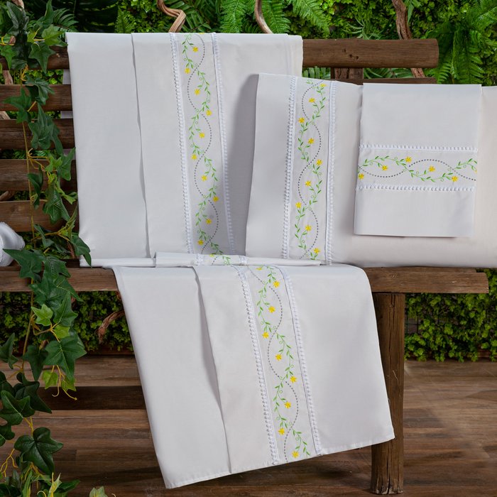 O Jogo de Cama Provence 4 Peças resgata a tradição dos antigos lençóis detalhados e cheios de bordado. Pronto para decorar seu quarto com requinte e sofisticação, a Coleção Provence é desenvolvida em tecido Percal 180 Fios 80/20 e possui um bordado com detalhes em ramos e flores, perfeito para quem busca uma decoração harmoniosa e clássica. O conjunto é composto pelo lençol de cima com bordado, lençol de baixo com elástico em toda a volta e duas fronhas bordadas. Conteúdo da embalagem: 1 Lençol de cima 2,40m x 2,20m 1 Lençol de baixo com elástico 1,88m x 1,48m x 30cm altura 2 Fronhas 70cm x 50cm. Composição: Tecido: 80% Algodão / 20% Poliéster.