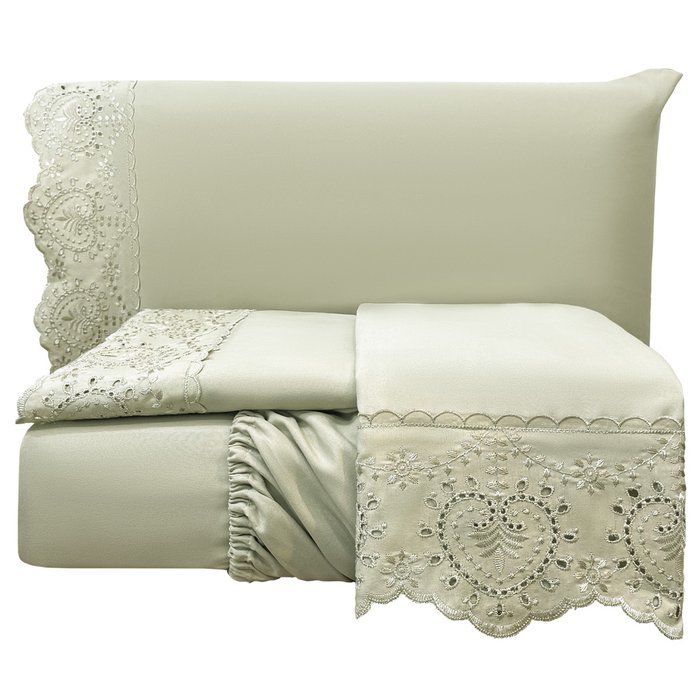 Jogo Cama Lençol Detail King Bordado Guipir Bordado Inglês Percal 300 Fios 4 Peças - Bege