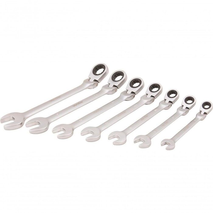 1 Jogo de chaves combinadas com catraca articulada, composto por um estojo plástico com 7 peças, sendo: 8 mm, 10 mm, 11 mm, 13 mm, 14 mm, 17 mm e 19 mm