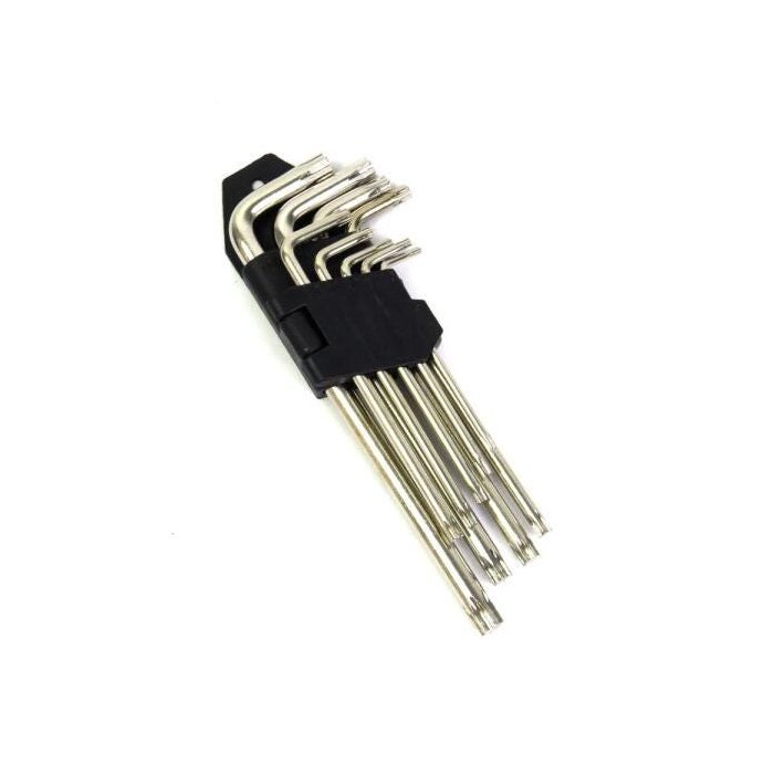 O Jogo Chave Torx média contendo 9 peças, ideal para uso profissional. Desenvolvida para serviços com parafusos torx, muito usado em automóveis. No formato parecido com uma estrela, possuem seis pontas de apoio para o aperto e desaperto do parafuso.